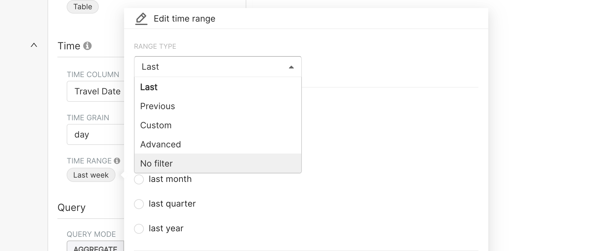 In the Time section, as before, keep the Time Column as Travel Date and Time Grain as month but this time for the Time range select No filter as we want to look at entire dataset.